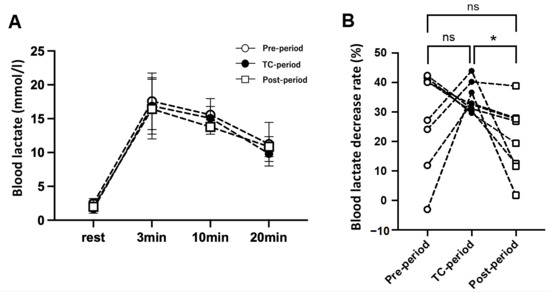 (A), Blood lactate levels (mmol/L) before (rest) and after (3, 10, and 20 min) the 40 s Wingate test in each period. (B), Percentage decrease in blood lactate level during the recovery phase from 10 to 20 min. The values are expressed as means ± SD. * p < 0.05 vs. the Post-period.