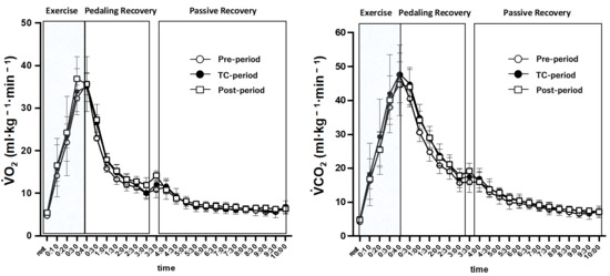 VO2 (ml·kg−1·min−1) and VCO2 (ml·kg−1·min−1) during and after the 40 s Wingate test in each period. The values are expressed as means ± SD.