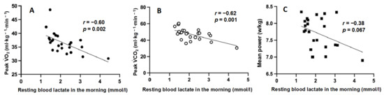 Relationship between resting La− concentration in the morning and 40-s WT parameters: the mean resting La− level during one week in each period showed a correlation with peak VO2 (R = −0.60, p = 0.002) and peak VCO2 (R = −0.62, p = 0.001) during the 40-s WT (Figure 6). Small non-significant correlations were found between mean resting La− levels and mean power during the 40-s WT (R = −0.38, p = 0.067).