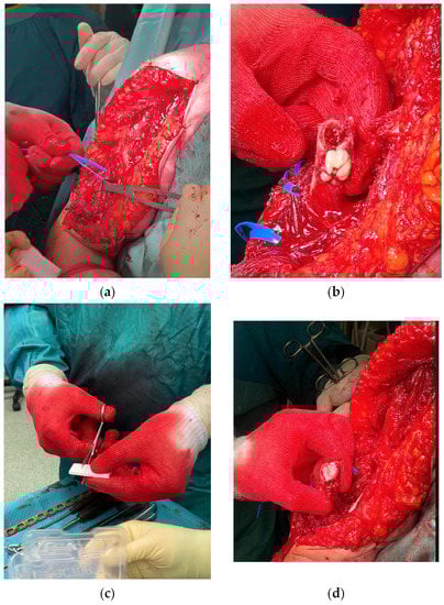 The fracture occurred at the shoulder’s stem tip without compromising the stability of the arthroplasty associated with cement leakage. The fracture was classified as type D according to the Unified Classification System (UCS) []. Type D is a fracture affecting one bone which supports two replacements, such as the humerus following shoulder and elbow replacement, or the tibia following knee and ankle replacement. [] The shoulder prosthesis was a reverse implant with a cemented stem, whilst the elbow arthroplasty was an uncemented Conrad Moore implant. Moreover, a severe poor bone stock was noted around the fracture site. Clinical examination revealed a high level of right arm pain and tenderness; a vast ecchymosis without any skin lesion and no signs of vascular or neurological injury were noted. The vital signs and the laboratory results were in the normal range despite the several comorbidities. The literature related to the management of such injuries was reviewed within the local Trauma and Orthopaedic Department, and the case was discussed at the local multidisciplinary meeting: The decision to proceed with surgical management was agreed upon (in agreement with the patient), and the treatment strategy consisted of open reduction, internal fixation with plating and cerclage, and xenografting from the equinus femur and biological bone grafting with adjunct growth factors in case of poor bone quality and stock. One week after the admission (after having held the aforementioned meetings and after the arrival of the surgical instrumentations and the graft), the patient underwent the planned surgical procedure (Figure 2).