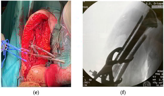 Treatment of IHF and its surgical steps: (a) extended deltopectoral approach and isolation of radial nerve; (b) removal of cement leakage from previous surgery; (c,d) preparation and insertion in the humeral canal of synthetic bone as a scaffold for bone ingrowth and growth factors; (e,f) Synthesis of the fracture, equinus graft medially as mechanical strut stabilised through plate and cerclages and intra-operative fluoroscopy after strut positioning.