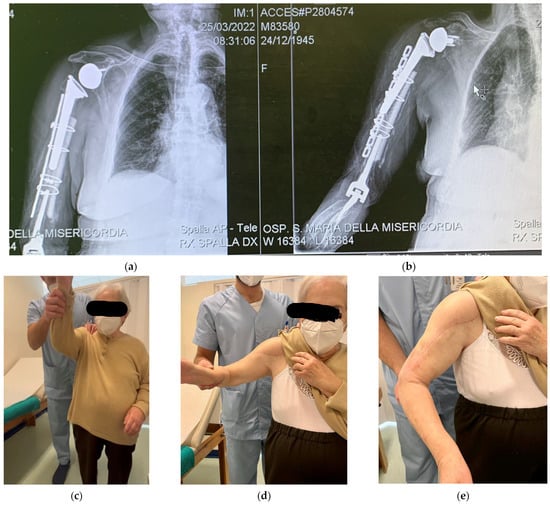 Radiological and clinical follow at 9 months post-op: (a,b) the X-rays show stability of the fixation metalwork and of the shoulder and elbow prosthesis, good bone healing process, and good strut integration; (c–e) satisfactory shoulder range of motion; no scare issues.