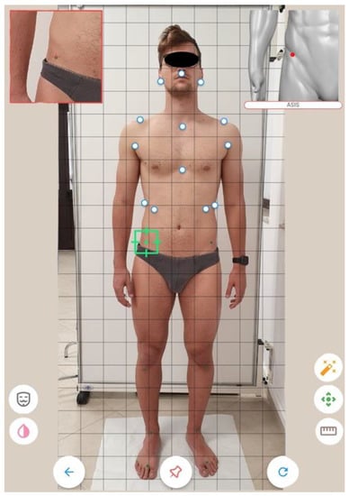 After the cropping phase, the app drives the user to position the digital markers, fostering this process with examples of the proper positioning with images. Table 1 shows all the anatomical landmarks taken into consideration by the app for calculating the postural variables.