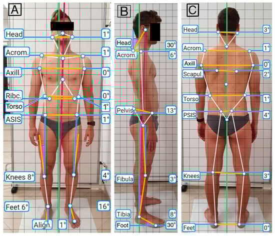 To avoid any wrong camera leveling during the image acquisition, the app’s interface shows a target that becomes green when the camera is leveled. After the picture is acquired, the app immediately steers the user to crop the image at the individual’s head and feet to minimize inconsistency in the proportion of different images. The Apecs app uses standardized digital landmarks and anatomical angles from one to four pictures, depending on the number of variables of interest to the investigation. The app calculates 24 postural variables from the predetermined anatomical markers in the three planes of the space examined. Figure 2 shows the points evaluated in the anterior coronal plane (a), the sagittal plane (b), and the posterior coronal plane (c).