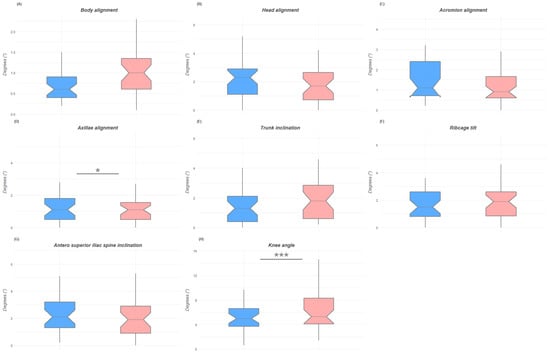 Box plots of the differences between male and female groups in the anterior coronal plane with indication of significance. Figure (A) is for body alignment; figure (B) is for head alignment, figure (C) is of acromion alignment, figure (D) is for axillae alignment, figure (E) is for trunk inclination, figure (F) is for ribcage tilt, figure (G) is for antero superior iliac spine inclination, figure (H) is for knee angle. *: p < 0.05; ***: p < 0.001.