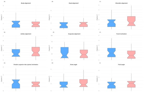 Data analysis comprised descriptive statistics to present the mean and standard deviation of the whole sample divided by gender. Inferential statistics comprised the Shapiro–Wilk test to assess the data distribution; the Student’s t-test was used to compare means between the male and female groups; statistical significance was set at p ≤ 0.05. Cohen’s effect size (d) was applied to identify meaningful differences between the groups. Based on Cohen’s criteria, d = 0.80 (absolute value) was considered a large effect size, and d = 0.50 (absolute value) was considered a medium effect size. Post hoc power calculations were performed with G*Power v.3.1. Three qualified examiners were selected to perform the positioning of the markers and the postural analysis in the two different parts of the day to assess the reproducibility of the app. The two-way mixed effect for absolute agreement was the model for calculating the intraclass correlation coefficient (ICC) for inter-rater agreement. The cut-off values for reproducibility based on a 95% confidence interval of the ICC estimate were <0.5 (poor), between 0.5 and 0.75 (moderate), between 0.75 and 0.9 (good), and >0.9 (excellent) [17]. All the statistical analyses were performed with R Project for Statistical Computing (Vienna, Austria).