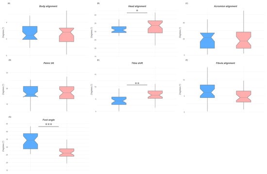 Box plots of the postural differences between male and female groups in the sagittal plane with indication of significance. Figure (A) is for body alignment; figure (B) is for head alignment, figure (C) is of acromion alignment, figure (D) is pelvic tilt, figure (E) is for tibia shift, figure (F) is for fibula alignment, figure (G) is for foot angle. *: p < 0.05; **: p < 0.01; ***: p < 0.001.