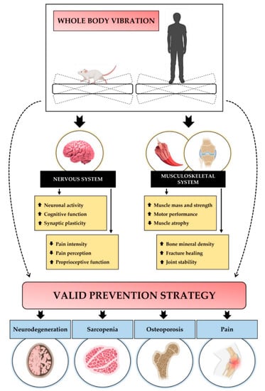 A non-systematic search strategy was adopted for the writing of this narrative review, selecting 100 scientific articles concerning the effects of vibratory training on the entire organism, with a focus on nervous and musculoskeletal tissues. The bibliographic databases MEDLINE and Google Scholar were used to select peer-reviewed articles of interest published between 1945 (start date) and 2022. The search strategy was based on the use of the following combinations of medical subject headings (MeHS) and keywords: (whole body vibration) AND (benefits); (whole body vibration) AND (nervous system); (whole body vibration) AND (cognitive function); (whole body vibration) AND (neurodegeneration); (whole body vibration) AND (brain); (whole body vibration) AND (musculoskeletal system); (whole body vibration) AND (bone); (whole body vibration) AND (muscle); (whole body vibration) AND (osteoporosis); (whole body vibration) AND (osteoarthritis); (whole body vibration) AND (sarcopenia); (whole body vibration) AND (pain); (whole body vibration) AND (low back pain); (whole body vibration) AND (fibromyalgia); (whole body vibration) OR (prevention); (whole body vibration) AND (exercise); (whole body vibration) OR (alternative strategy). For each combination listed, the keyword “whole body vibration” was replaced with the terms “vibratory training”, “mechanical vibration” and “WBV”. The results included in vitro and in vivo experimental studies, systematic reviews and meta-analyses, narrative reviews, randomized controlled trials and clinical trials to provide a comprehensive overview.