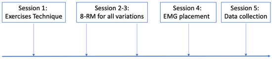 The present investigation was designed as a cross-over, repeated-measures, within-subject study and was conducted in line with previous studies from our laboratory [5,6,7,8,9]. The participants were involved in five different sessions (Figure 1). In the first session, the participants were familiarized with the technique defined for each variation. In sessions two and three in random order, the 8-RM [8] was determined for the biceps curl using straight or EZ barbells, and for each barbell with or without the arm flexion. In the fourth session, the participants were familiarized with the electrodes’ placement while performing all the biceps curl variations. In the fifth session, the muscles’ maximum excitation was first measured. Then, after a minimum of 30 min of passive recovery, the participants performed a non-exhaustive set for each exercise in a random order, with an inter-set pause of 10 min. Each session was separated by at least three days, and the participants were instructed to avoid any further form of resistance training for the entire duration of the investigation. Overall, the present procedures were chosen to avoid any insurgence of fatigue, acute in the range of minutes, or possible exercise-induced muscle damage in the range of days.