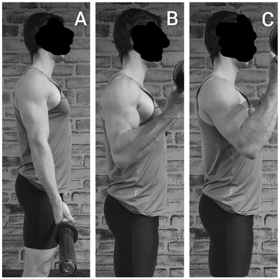 Using either the straight or the EZ barbell, the biceps curl was performed not flexing or flexing the humerus, for a total of four variations. Irrespective of the variation, and following recent updates on appropriate descriptions of the resistance exercise technique [4], (i) the load was fixed as 8-RM, (ii) six repetitions were performed—not to failure—to avoid fatigue, (iii) the action was performed with a full range of movement and (iv) with a tempo of 1-2-1-2 s for the first isometric, the ascending, the second isometric and the descending phase, respectively, so that (v) all dynamic phases were performed, while (vi) using an external focus. In all four variations, the arms were close to the trunk. Notably, using the barbell does not allow for a full elbow extension because the barbell will hit the thighs during the descending phase, so the range of movement was stopped when the barbell touched the thighs (Figure 3A). In the two variations in which the arms were not flexed (straight or EZ barbell), the range of movement was based on the elbow flexion-extension (Figure 3B). In the two variations which were flexed (straight or EZ barbell), this was accompanied by a flexion of the arms (approximately 30°) (Figure 3C). The participants were instructed to avoid sagittal oscillations of the trunk or any movement of the lower limbs and to exaggerate the elevation of the scapulae, and the technique was checked by three operators. A visual feedback was provided to help the participants to follow the tempo for each phase [5,9,27]. The set was repeated in case of disproportionate duration of any phase, as for any disproportionate movement of the trunk or lower limbs.