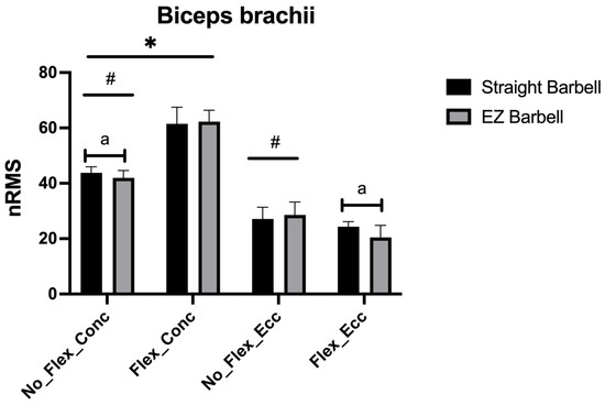 The nRMS for the biceps brachii is shown. a: p < 0.05 vs. the EZ barbell; #: p < 0.05 vs. flexing the arms; *: p < 0.05 vs. the descending phase.