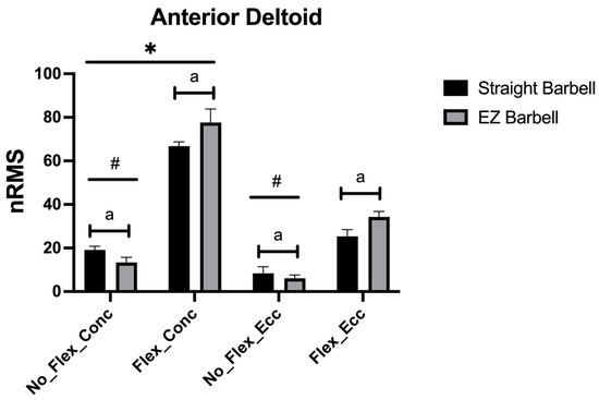 While acknowledging that the non-significant barbell x flexion x phase interaction, albeit with a large effect size, may derive from the limited sample size, the anterior deltoid showed an interesting behavior as the factor of flexion appears to produce curious consequences. Indeed, when not flexing the arms, a greater excitation was observed using the straight vs. EZ barbell in both the ascending (ES: very large) and descending (ES: moderate) phases. On the contrary, when flexing the arms, the anterior deltoid was more excited using the EZ vs. straight barbell in both the ascending (ES: very large) and descending (ES: very large) phases. Performing the biceps curl with the handgrip we chose as the technique for the straight barbell, i.e., larger than the shoulders, forces the humerus to be greatly externally rotated compared with the external rotation necessary to grip the EZ barbell. Consequently, the anterior deltoid is much lengthened as it acts as an internal humerus rotator [33]. The EMG signal appears to be sensitive to the muscle elongation, with a greater signal observed at the longer muscle length [34]. Therefore, the greater external rotation of the humerus without any other movement, i.e., when not flexing the arms, may explain the greater excitation of the anterior deltoid using the straight vs. EZ barbell. In contrast, flexing the arms greatly engages the anterior deltoid as the prime mover [33]. The non-excessive external rotation using the EZ barbell may place the anterior deltoid in a more favorable moment arm [33], recreating the “full can” position of the lateral raises [8]. This may explain the greater nRMS recorded during using the EZ vs. straight barbell.