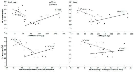 When analyzing between the sexes, significantly different correlation coefficients were observed between males and females for fat percentage in 1-RM strength and relative strength in the bench press and squat, lean mass in relative strength for the bench press, and thigh length in the AMRAP test for the squat (Z-score ≥ −0.198, p ≤ 0.05) (Table 2). Males increased absolute and relative 1-RM squat and bench press performance with increasing fat percentage, while women increased this performance with decreasing fat percentage (Figure 1).