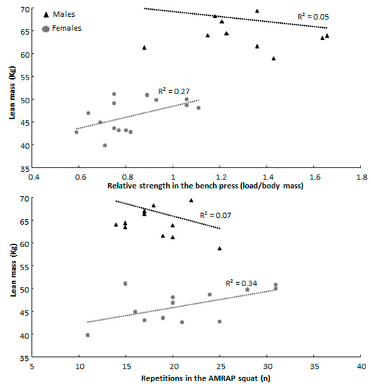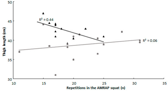 Furthermore, females showed a positive correlation between increased lean body mass and AMRAP squat and relative 1-RM bench press performances, while males showed a negative correlation with these two parameters. In addition, the number of repetitions in the AMRAP squat test increased when thigh length was shorter in males, while no correlation was found in females (Figure 2).