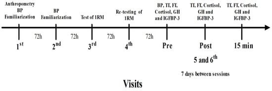 The relationship between hormonal responses and muscle hypertrophy remains a debated topic in the literature [] and it has been suggested that HI and low-intensity (LI) plus BFR (LI + BFR) exercise may be associated with similar levels of hormone secretion []. Therefore, it is important to investigate the acute hormonal response resulting from RE, with and without BFR using MJ exercises. Therefore, the purpose of the present study was to investigate the acute effects of multi-joint resistance exercise (MJRE) with BFR on hormonal responses, specifically on levels of total testosterone (TT), FT, cortisol, GH, and insulin-like growth factor binding protein 3 (IGFBP-3).