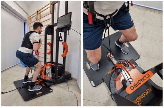 Isoinertial machines in health care have increased over the years due to their versatility. The isoinertial system is independent of gravity, and it is based on a flywheel technology providing also an eccentric overload []. It uses the moment of inertia of a wheel in rotation during the concentric phase while slowing to resist the kinetic energy collected until stopping the wheel at the end of the eccentric phase []. Resistance is proportional to acceleration, allowing the exercise to be conducted in a continuous state of acceleration/deceleration []. The characteristics of safety, simplicity of operation, and almost absent risk of trauma support the use of isoinertial machines in health care and rehabilitation []; moreover, with these machines it is possible to train different districts of the body, giving also a reduction of the cost for those who implement it in their practice. The torque moment of the system is capable of guiding the subject with a cyclic rhythm, supporting the correct execution of a movement, and stimulating balance []. This training method does not work with the percentage of one-repetition maximum allowing a precise monitoring of the performance and neuromuscular fatigue, maximizing the training [,]. Their employment ranges from pure training and injury prevention to neurological rehabilitation [,,].