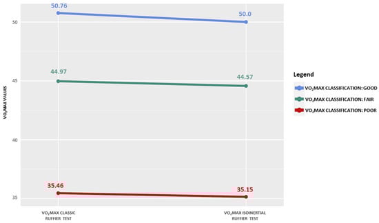 Slope chart comparing the VO2max of classic and isoinertial Ruffier tests.