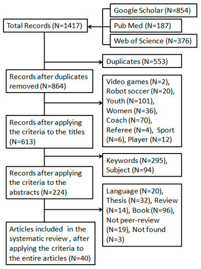 This review was based on research articles published up until 25 September 2022 (with no restriction on the year of publication) using the search engines PubMed, Web of Science, and Google Scholar. During our search in PubMed and Web of Science, we combined the terms “soccer” and “style” using the Boolean operator AND. In contrast, when searching Google Scholar, due to the large number of initial results, we utilized the expression “soccer style” as a more focused search term. A prerequisite for the inclusion of an article in our study was the presence of the two mentioned terms (in singular or plural) as keywords, either in the title or in the abstract of each article [26].