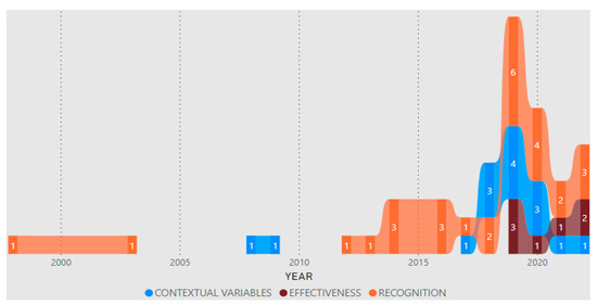 Table 2 shows the separation of studies based on the main categories mentioned in the methodology (assessed outcomes), considering that some of the articles belong to more than one category. Figure 3 provides a visualization of the number of articles by year and category.