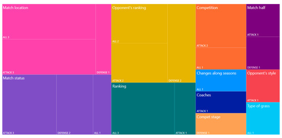 Team’s ranking, opponent’s ranking, and match status are also variables whose effect on playing styles has been studied extensively. The research of Gonzalez-Rodenas, Aranda, and Aranda-Malaves [45], showed that high-ranked teams were less likely to use direct attacks than combinative attacks in comparison with low-ranked teams. García-Aliaga, Marquina Nieto, Coterón, Rodríguez-González, Gil Ares, and Refoyo Román [60] found that the top-ranked teams in the EPL differentiated from the rest of the teams in the same league by making less long passes, playing more vertically, even at the expense of accuracy, and dribbling. In [44], using EPL data of the 2015–2016 season in which Leicester shocked the league by winning it, it was demonstrated that established defense was prevalent among lower-ranked teams, while the champion was dominant in transitions and the rest of the high-ranked teams dominated established attack and set pieces. In this case, there appears to be a disadvantage associated with studies that collect their sample data from a single competition or, even worse, from a small number of matches. In such cases, generalizing the outcomes is inherently risky, as teams like Leicester, for instance, rarely win the league. As shown in Table 1, only 13 of the 40 studies processed data from more than one competition. As demonstrated by Lago [30], Santos, Lago-Peñas, and García-García [35], Fernandes, Camerino, Garganta, Hileno, and Barreira [46], Gollan, Bellenger, and Norton [44], and Gonzalez-Rodenas, Aranda, and Aranda-Malaves [45], the quality of the opposition exhibited similar trends with math location. Finally, match status appears to influence the adoption of different playing styles significantly. In particular, winning teams present higher probabilities of attacking by means of counterattacks and direct attacks than combinative attacks compared to losing teams. In addition, they apply high pressure less frequently [37,41,45,46].