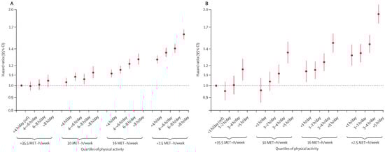 Associations of sitting time, television viewing time, and physical activity with all-cause mortality. (A) Analysis of sitting time (n = 1,005,791) and (B) television viewing time (n = 465,450) as well as their relationship to physical activity levels and mortality risk [].
