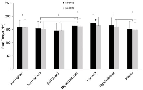 Mean (error bars are SD) peak torque (PT) values for the isokinetic 60 deg/s (Isok60) testing condition for trials 1 (T1) and 2 (T2) for each of the PT score selection parameters. * indicates higher than all other conditions. † indicates lower than “Set 1Highest” condition only for Isok60T2. Isok60 trials 1 and 2 showed the same results (bracket symbols combine the two trials with respect to denoting significance) in all cases except one (noted by †).