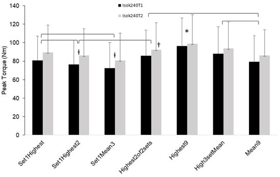 Mean (error bars are SD) peak torque (PT) values for the isokinetic 240 deg/s (Isok240) testing condition for trials 1 (T1) and 2 (T2) for each of the PT score selection parameters. ‡ significantly different from all other conditions except for the “mean9” condition”. † significantly different from “High3setMean” condition only for Isok240T2. * indicates significantly higher than all other conditions except for “Set1Highest” condition for both trials 1 and 2, and the “Highest2of2sets” condition for Isok240T1 only. Isok240 trials 1 and 2 showed the same results (bracket symbols combine the two trials with respect to denoting significance) in all cases except as noted by † and * cases.