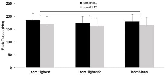 Results for the IsomPT variables showed there was a significant main effect for both T1 (p < 0.001) and T2 (p = 0.001). The post hoc comparisons revealed the differences were all the same for the T1 and T2 trials. For both T1 and T2, all sets were different from each other, such that IsomHighest was higher than IsomHighest2 (p < 0.01) and IsomMean (p = 0.01) and IsomHighest2 was higher than IsomMean (p < 0.01). These results are displayed in Figure 3. Supplementary Table S1 presents the mean and SD values for all the isokinetic and isometric PT variables.