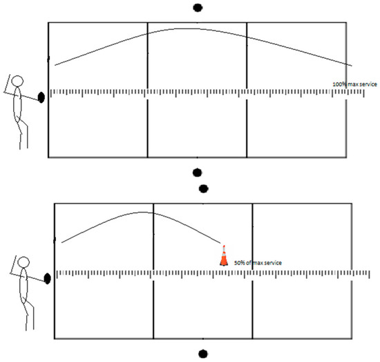 In the FSTx, the athlete serves in front of the baseline, imagining the net is on the court (Figure 4). The measurer counts 50% of the maximum serve and places the cone on that spot. Then, athletes have to serve the ball six times to that target.