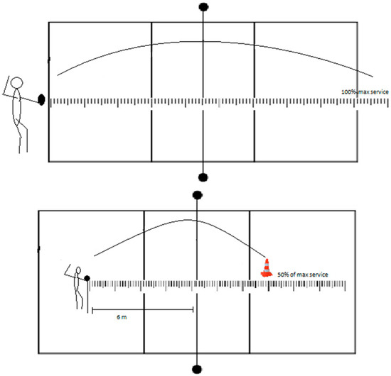 In the FSTnet, athletes stand behind the baseline while serving (9 m from the net; Figure 3). After three maximum services over the net, the measurer counts 75% of the athlete’s maximum serve and marks the target with a cone. Then, athletes have to serve the ball six times to that target. A measure of 75% was taken, unlike other tests, because the target would be farther from the net with this percentage. With 50%, the target for most participants would be near the net, and the test could not be performed since the net would interfere with hitting the target.