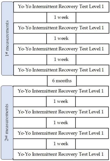 Two sets of measurements, with a six-month break between them, were performed in order to conduct the experiment on similar performance levels during both occasions (Figure 1). During the 6-month break period, the participant participated in regular physical activities, similar to before the first set of measurements (team sports practice 3 times per week plus strength training). Each set consisted of four measurements separated by a one-week rest period. The participant was asked to avoid intense exercise 48 h preceding and during the study. The experiment was carried out under the same standardized conditions (e.g., in the same location at the same time).