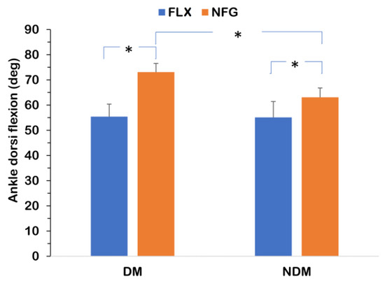 Results of the passive ankle dorsi flexion measurement (FLX: flexible group, n = 10; NFG: inflexible group, n = 14; DM: ipsilateral ankle joint of the preferred arm for the spike; NDM: contralateral ankle joint of the preferred arm for the spike; *: p < 0.05).