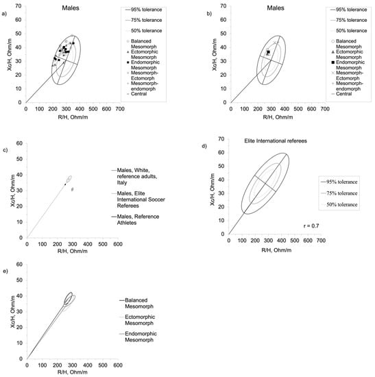(a) Scattergram of the international elite soccer referees, according to the somatotype category, within the BIVA point graph with the 50%, 75% and 95% tolerance ellipses of the general population; (b) the average position of the different somatotypes; (c) comparison with the general [24] and athletic references [17]; (d) 50%, 75% and 95% tolerance ellipses derived from the current sample; (e) comparison among the different identified somatotypes that characterized elite referees.