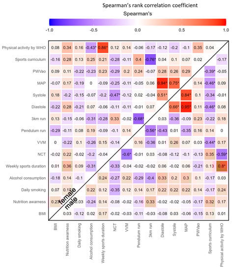 Correlation matrix of the investigated variables stratified by sex for overview (using Spearman’s rank correlation coefficient). Nutrition awareness and daily smoking were encoded as 1 for “yes” and 0 for “no”. Alcohol consumption had five levels: 5 = daily, 4 = weekly, 3 = weekends, 4 = monthly, 1 = less than monthly. School curriculum was encoded as 1 for SCS and 0 for OCS, while physical activity was encoded using WHO guidelines as 1 for ≥300 min per week (PAS) and 0 for <300 min per week (PIS). * p < 0.05.