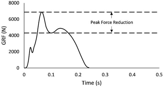 A sample vertical ground reaction force (GRF) trace with visual representation of peak force reduction (PFR) in depth jumping (DJ).