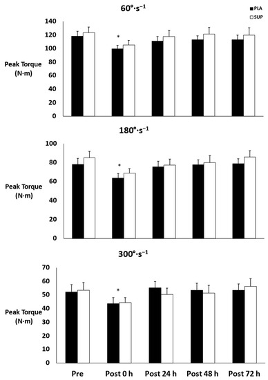 Mean ± SE of peak torque. Pre: Pre-test. Post 0 h: Post-test 0 h. Post 24 h: Post-test 24 h. Post 48 h: Post-test 48 h. Post 72 h: Post-test 72 h. PLA: Placebo. SUP: Tart Cherry Supplement. * Denotes significant difference from pre- and post-test 24, 48, and 72 h.