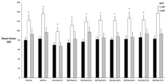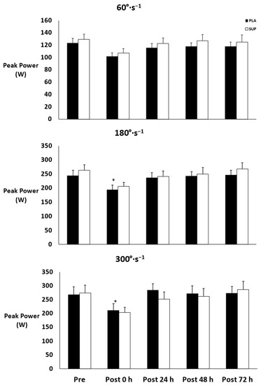 There was no three-way interaction for time × condition × velocity (p = 0.648) and no two-way interactions for time × condition (p = 0.665) or condition × velocity (p = 0.258). However, there was a two-way interaction for time × velocity (p < 0.001). Simple main effects were found for 180°· and 300 (p < 0.001) but not for 60°·s−1 (p = 0.421). At 180, peak power decreased from pre- to post-test 0 h (p = 0.018) and increased at post-test 24 h (p = 0.039), post-test 48 h (p = 0.011), and post-test 72 h (p < 0.001) from post-test 0 h. At 300, peak power decreased from pre- to post-test 0 h (p = 0.016) and increased at post-test 24 h (p = 0.004), post-test 48 h (p = 0.009), and post-test 72 h (p < 0.001) from post-test 0 h (Figure 3).