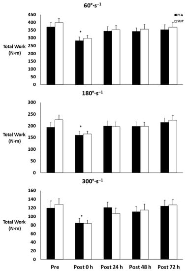 Mean ± SE of total work. Pre: Pre-test. Post 0 h: Post-test 0 h. Post 24 h: Post-test 24 h. Post 48 h: Post-test 48 h. Post 72 h: Post-test 72 h. PLA: Placebo. SUP: Supplement. * Denotes significant difference from pre- and post-test 24, 48, and 72 h.