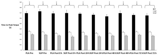 Mean ± SE of time-to-peak torque. Pre: Pre-test. Post 0 h: Post-test 0 h. Post 24 h: Post-test 24 h. Post 48 h: Post-test 48 h. Post 72 h: Post-test 72 h. 60°: Velocity of 60. 180°: Velocity of 180. 300°: Velocity of 300. * Denotes significant difference among velocities.