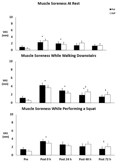 Mean ± SE of muscle soreness. Pre: Pre-test. Post 0 h: Post-test 0 h. Post 24 h: Post-test 24 h. Post 48 h: Post-test 48 h. Post 72 h: Post-test 72 h. PLA: Placebo. SUP: Supplement. * Denotes significant difference from pre-test. ᶤ Denotes significant difference from post-test 0 h.