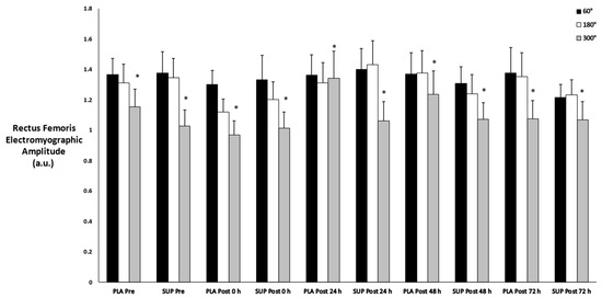 Mean ± SE of concentric rectus femoris muscle activation. Pre: Pre-test. Post 0 h: Post-test 0 h. Post 24 h: Post-test 24 h. Post 48 h: Post-test 48 h. Post 72 h: Post-test 72 h. 60°: Velocity of 60. 180°: Velocity of 180. 300°: Velocity of 300. * Denotes significant difference compared to 60 and 180.