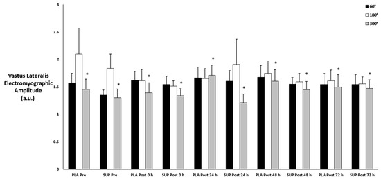 Mean ± SE of vastus lateralis muscle activation. Pre: Pre-test. Post 0 h: Post-test 0 h. Post 24 h: Post-test 24 h. Post 48 h: Post-test 48 h. Post 72 h: Post-test 72 h. 60°: Velocity of 60. 180°: Velocity of 180. 300°: Velocity of 300. * Denotes significant difference compared to 180.