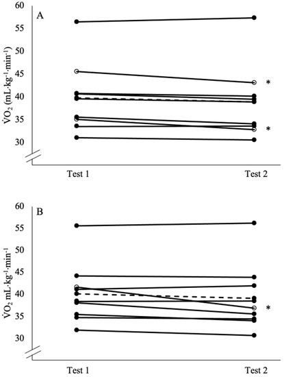 Individual (solid line and closed circles) and mean (dashed line) O2 responses from the cardiopulmonary exercise test (CPET) 1 compared to test 2 (A), and the verification phase test 1 compared to test 2 (B). * indicates an individual (solid line and open circles) exceeded the minimal difference to be considered real for the CPET (2.14 mL·kg−1·min−1) or the verification phase (3.52 mL·kg−1·min−1).