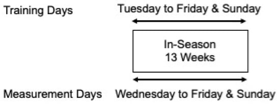 Subjects were recruited from a Division I collegiate football team located in the southeastern region of the State of Florida. The athletes were participating in their routine 13-week “in-season” training program. Practice sessions included aerobic, speed, strength, agility, and power-focused exercises. While each training session varied daily and weekly, the athletes consistently engaged in moderate-vigorous intensity exercise lasting between 120 to 180 min every, Tuesday, Wednesday, Thursday, Friday, and Sunday (Figure 1). The prospective participants were recruited from a pre-selected group of athletes the coaches identified as “starters”, which were athletes that competed in nearly every regulation game and for most of its duration. Starters were recruited as they endured a greater physiological load during a given week consequent to participating in weekly competitions. Additionally, due to the wide variability in movement patterns across player positions, only starting athletes playing “heavy running” positions including cornerback, running back, tight end, and wide receiver were included in the primary analyses. Prior to any measurements, the athletes were informed of the benefits and risks of the study and the conflicts of interest of all authors. All athletes participating voluntarily consented to the study. All study protocols followed the ethical principles defined in the Declaration of Helsinki and were approved by the university’s Institutional Review Board (IRB #20191223).