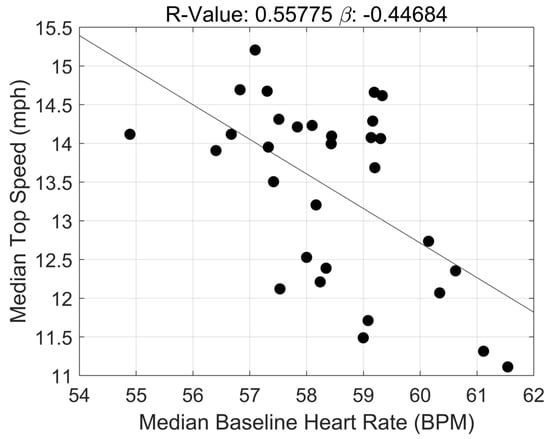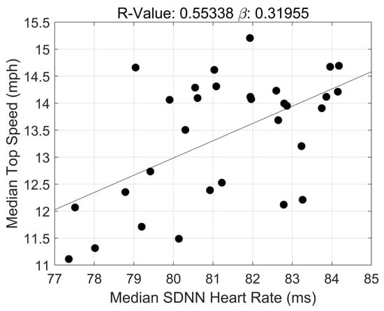 The correlation coefficients for the associations between exercise cardiac load, ANS recovery, and maximum running speed during in-season training are presented in Table 3. Statistically significant, negative associations between both acute and cumulative exposure to exercise cardiac loads and maximum running speed achieved during in-season training (acute: β = −0.11 ± 0.00, 95% CI: −0.12, −0.10; p < 0.0000; cumulative: β = −0.15 ± 0.04, 95% CI: 0.00, 0.72; p < 0.0000). Strong statistically significant correlations were also found between ANS recovery metrics and maximum running speed. Specifically, baseline HR was negatively associated with maximum speed (β = −0.45 ± 0.12, 95% CI: −0.70, −0.19; p = 0.001). Both metrics of HRV, rMSSD and SDNN, were significantly and positively associated with maximum running speed: (β = 0.32 ± 0.09, 95% CI: 0.14, 0.50; p < 0.03 and β = 0.35 ± 0.11, 95% CI: 0.13, 0.57; p < 0.02).