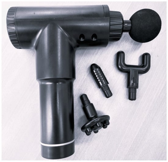 Massage guns are hand-held mechanical devices that have a shape like a small jackhammer, are electric or battery powered and utilize different shaped applicator tips (e.g., large and small ball, flat tip, bullet/pointy tip and fork) [] (Figure 1). These devices use percussive therapy, achieved by the rapid tip movement, to deliver bursts of pressure/vibration/massage to the myofascial tissues (i.e., fascia, muscle belly or tendon), which is thought to promote blood flow, reduce myofascial restriction and tension, improve range of motion, alleviate pain and break up trigger points []. As they are very versatile, massage guns have become increasingly popular in recent years, being used in both clinical and sporting contexts, for pre-activity (warm-up), post-activity (recovery) or part of a treatment [].
