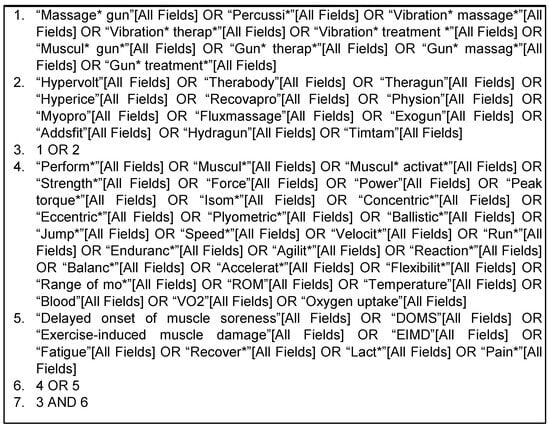 For the search strategy, a conjunction of keywords, mesh terms and established search filters were used. The main keywords used to search in the databases were “percussive therapy”, “vibration therapy” and “massage gun”. The terms (and their associates/derivatives) were then combined with the appropriate truncation and Boolean connectors. They were identified after preliminary literature searches and by crosschecking them against previous relevant studies. There was no language or publication date restrictions. Additional publications that were not found during the original database search were identified through manual searches of the personal, related studies, website bibliographies and references lists. An example of an online search strategy draft used in the MEDLINE database is presented in Figure 2: