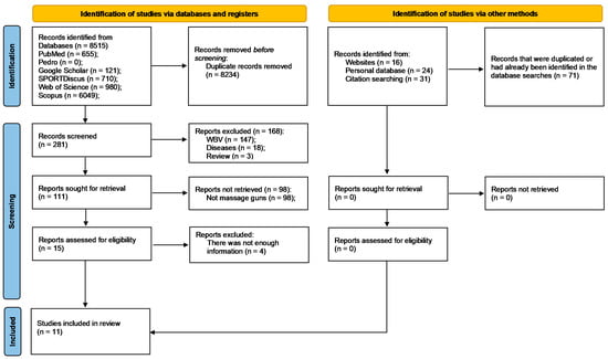 Database searches returned 8586 records of which 8305 were duplicates. From those, 281 records were screened, but only 11 could be included [,,,,,,,,,,]. The flow diagram in Figure 3 summarizes the selection process.