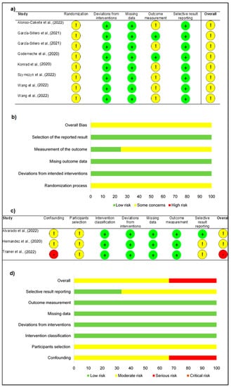 After the selection of the studies, the reviewers independently appraised the risk of bias of the 11 studies [,,,,,,,,,,]. Nine [,,,,,,,] were accessed using RoB 2 and three [,,] using ROBINS-I. The RoB 2 showed two problematical domains within the studies, the randomization process and the measurement of the outcome, both with the most evaluations of moderate risk of bias (100% and 75%, respectively). The domain deviations from intended interventions, missing outcome data and selection of the reported result were evaluated in all studies with low risk of bias (Figure 4a,b). In the ROBINS-I, three noticed domains were found, namely confounding, selection of the participants and selection of the reported result (one low risk of bias, seven moderate risks of bias and one serious risk of bias). The classification of interventions, deviations from intended interventions, missing data and measurement of outcomes were the best domains classified, all with low risk of bias (Figure 4c,d). The overall classification of the 11 studies was mostly of moderate risk of bias (Figure 4b,d).