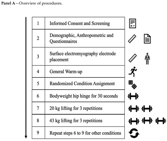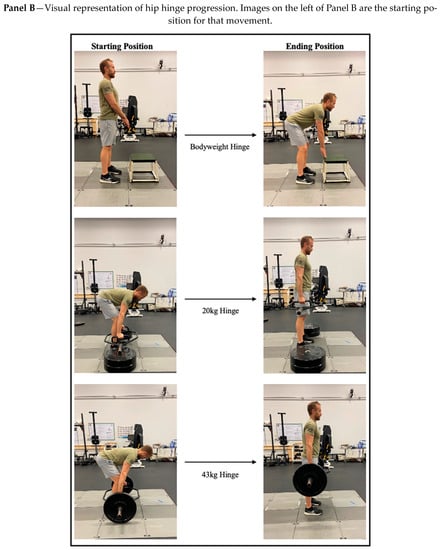 For each condition, a battery of cognitive, static, and dynamic movement tasks was performed, including a hip hinge progression. For the aim of the present study, the hip hinging movements will be the focus of the subsequent sections. While the conditions were randomized, the tasks for each condition were performed in a constant order, with the hip hinge progression performed last. The fixed task order was determined after pilot testing and in consideration with warm-up guidelines from the National Strength and Conditioning Association (NSCA) []. Subjective feedback from participants during pilot testing was that the procedures used in the current study were not fatiguing and the intensity of tasks within a condition went from lowest (i.e., standing tasks) to highest intensity (i.e., heaviest loaded hip hinge). Time to complete the study was approximately 150 min, with each condition typically lasting 20–25 min. To avoid circadian rhythm effects on neuromuscular performance, all testing was conducted in the afternoon between 12 pm and 3 pm []. All participants were given 5 min of rest between each condition trial and 30 s to 1 min of rest between each task.